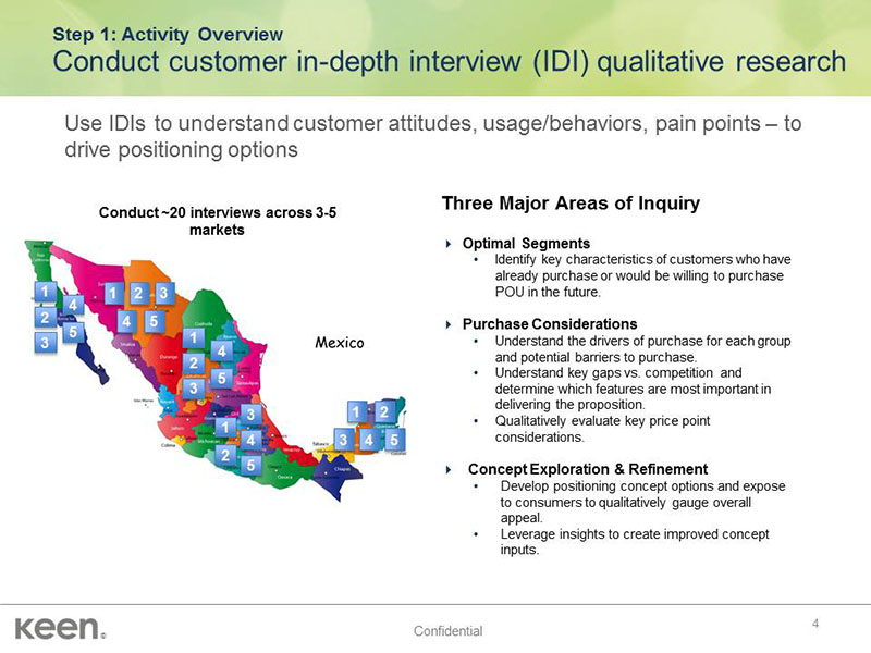 In addition to the information gained from qualitative market research – engaging University of Guadalajara International Business Management Sciences Department – we have enlisted a prominent Marketing Consultancy, Keen Strategy. Keen is highly experienced in leveraging qualitative feedback to: a) Identify the statistical and formulaic basis to pinpoint the catalysts of behavior change; and b) Create a concept matrix to validate highest potential ideas for each market space. (More on KEEN Strategy>)